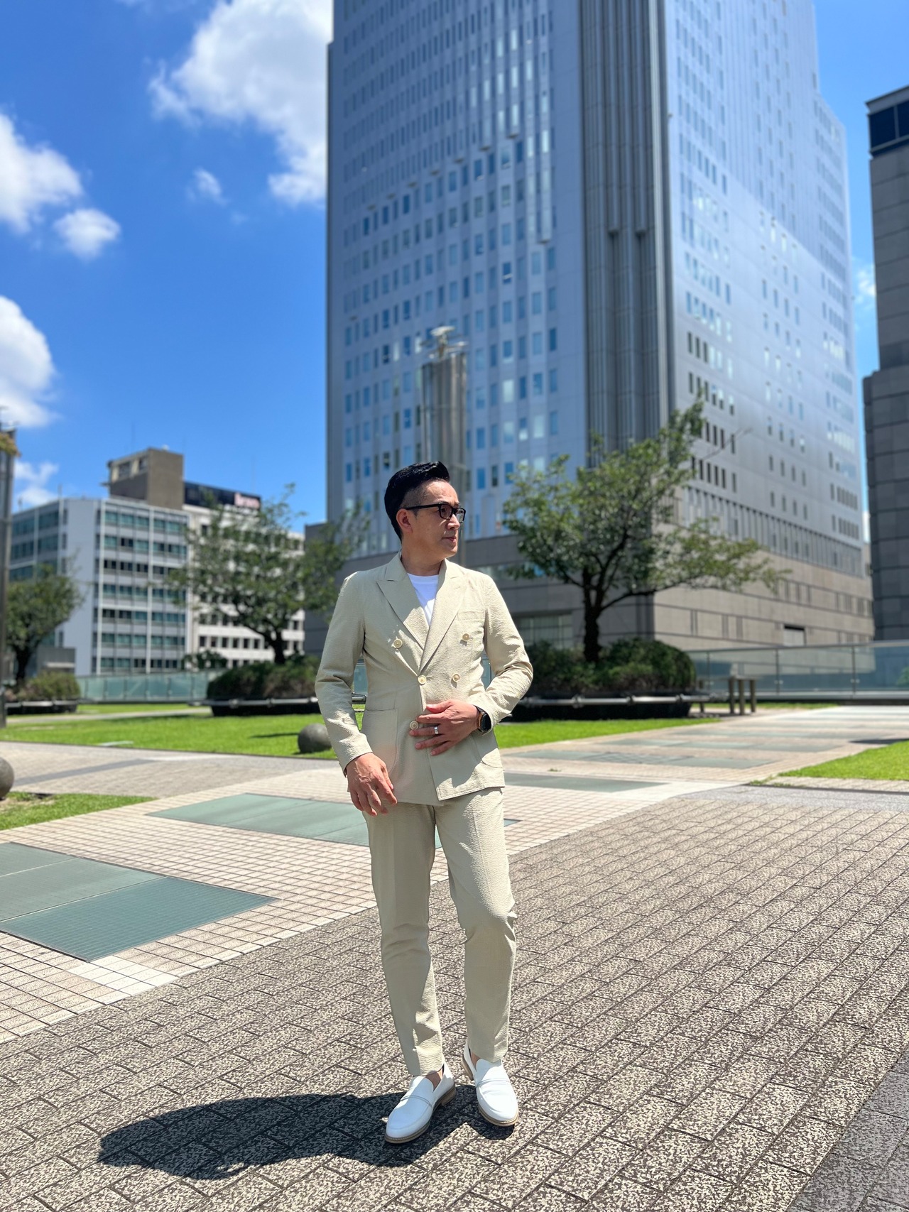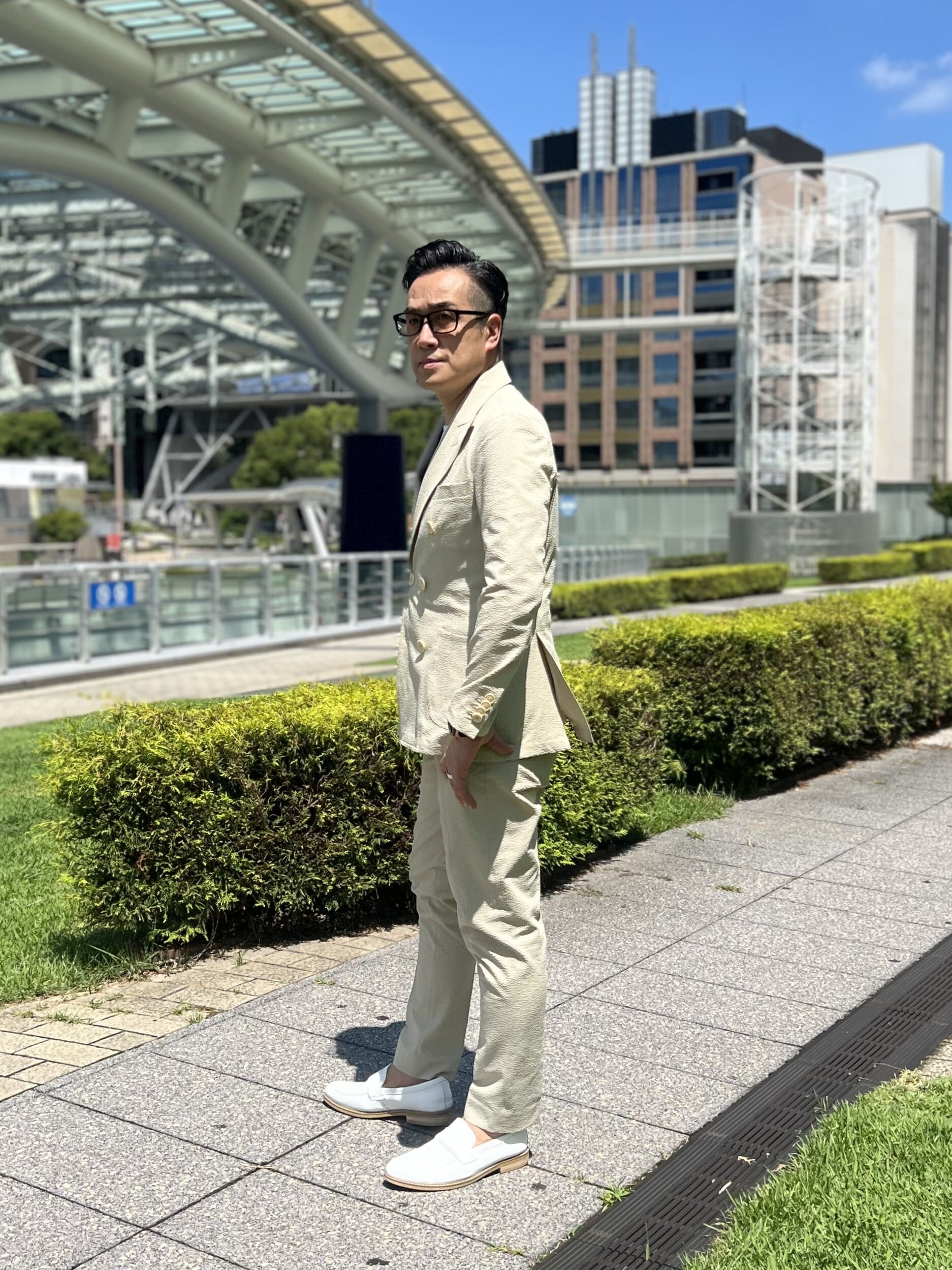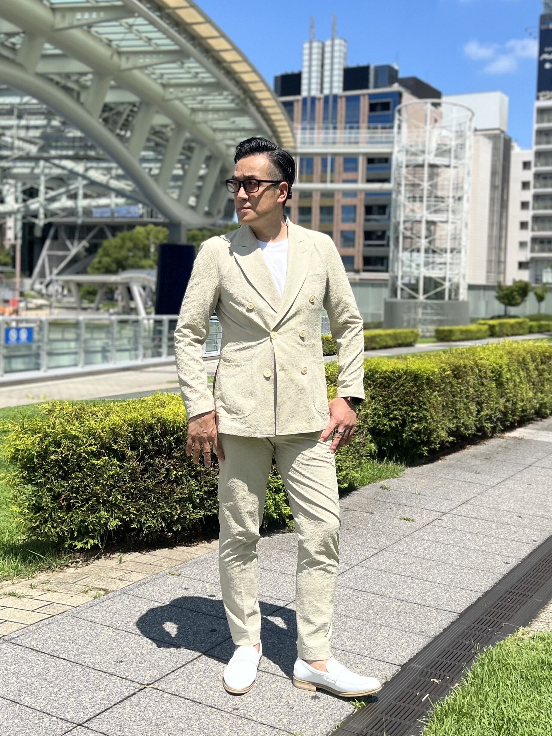 涼しさと着心地の良さにこだわったシアサッカー生地ダブルジャケットセットアップ。 肌にべったりと張り付かない凹凸のある生地で、ストレッチが効いているため、着ていて疲れません。 カラーは、セージグリーン。春夏らしい涼やかさもある柔らかな灰みのグリーンは、光の加減でライトグレーにも見える色合いです。
