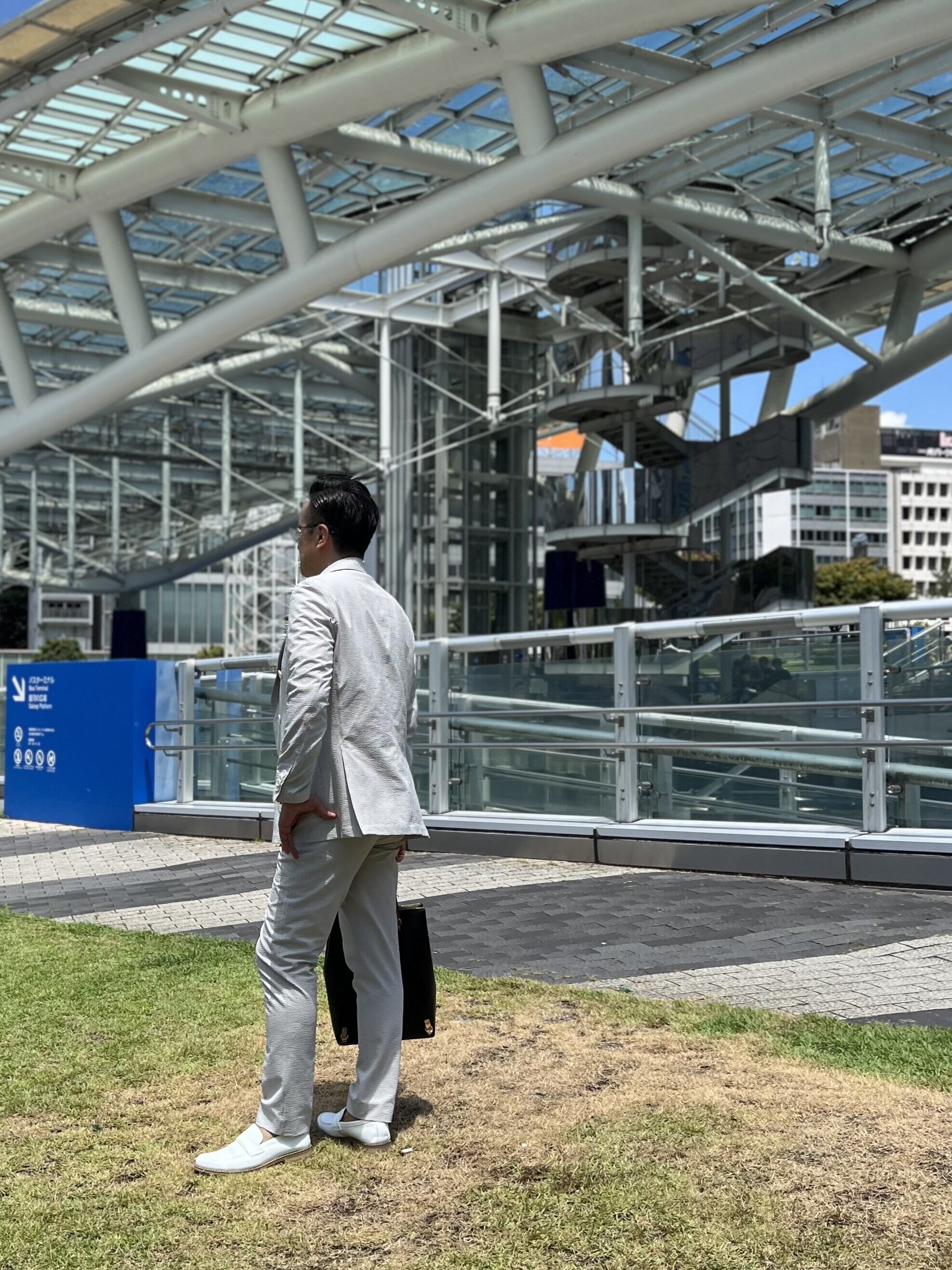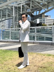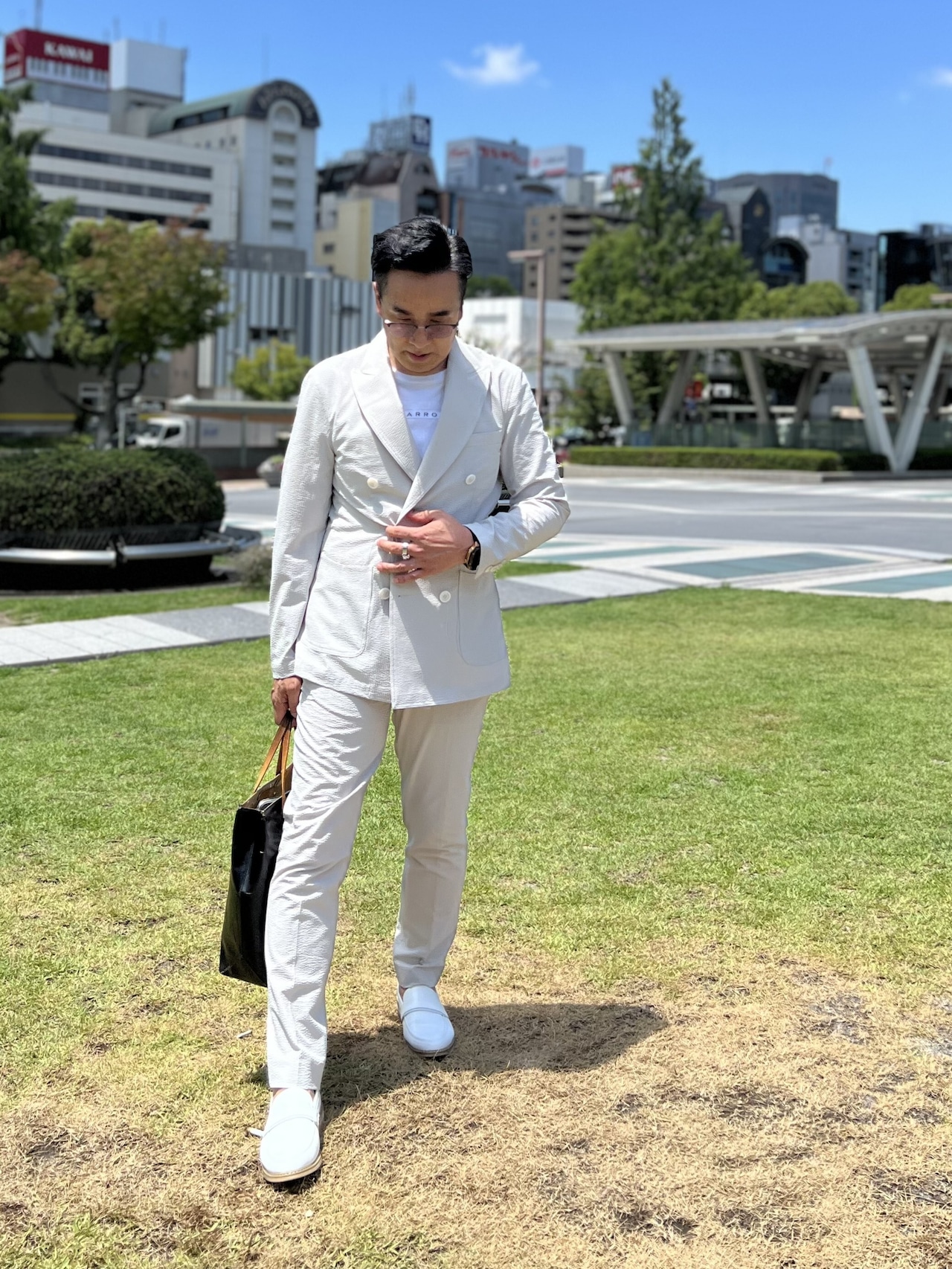 涼しさと着心地の良さにこだわったシアサッカー生地ダブルジャケットセットアップ。 肌にべったりと張り付かない凹凸のある生地で、ストレッチが効いているため、着ていて疲れません。 カラーは、ライトグレー。春から夏まで爽やかに着られる涼し気なライトグレーは、光の加減で白に近いシルバーにも見える色合いです。