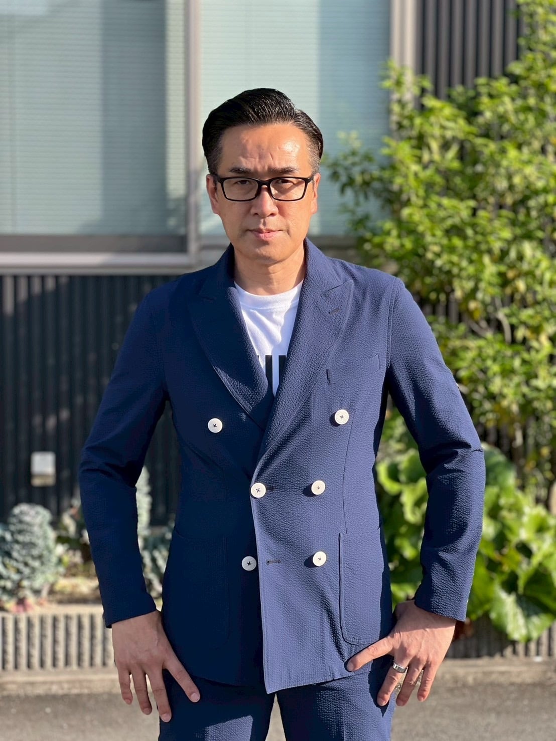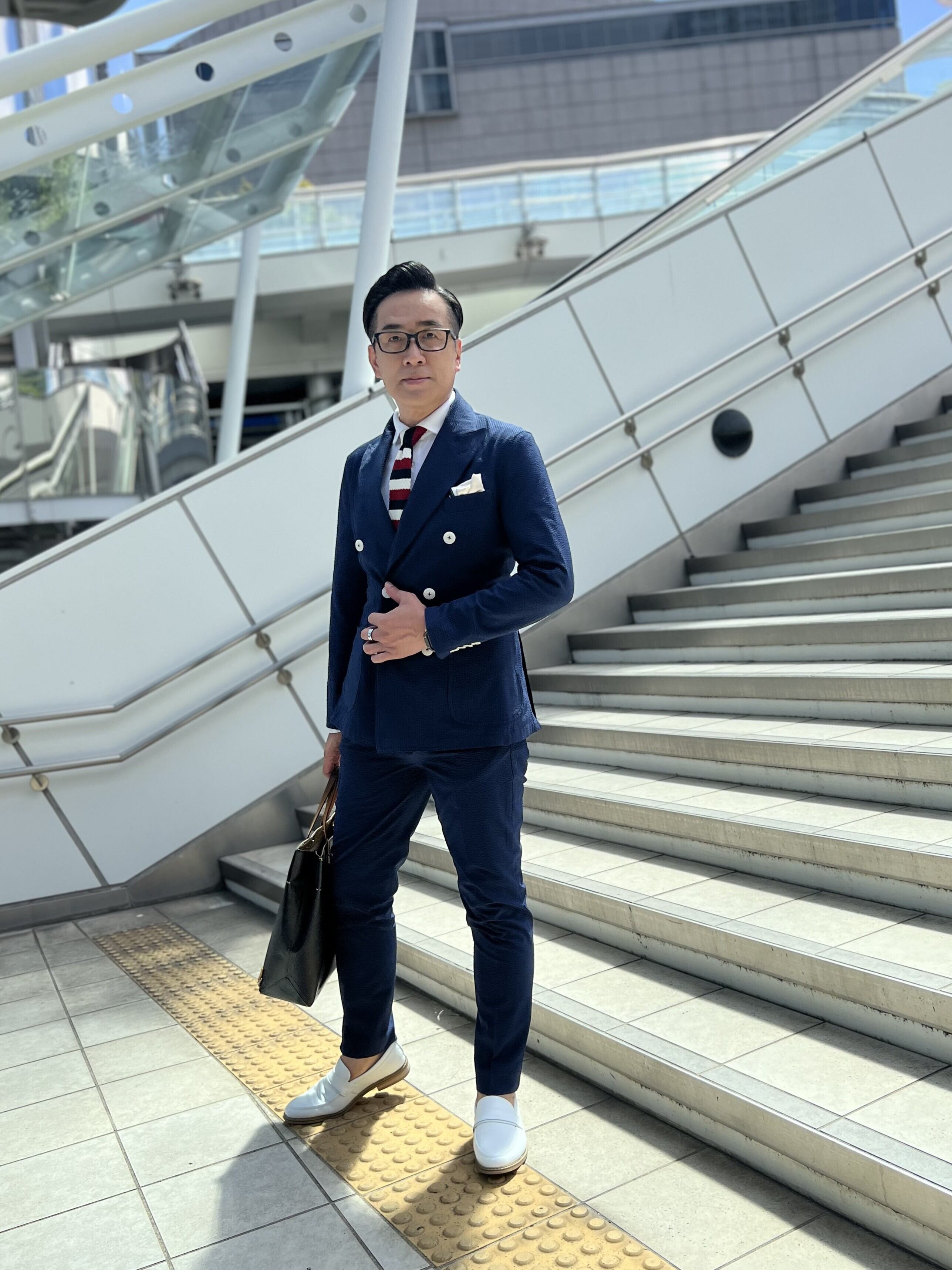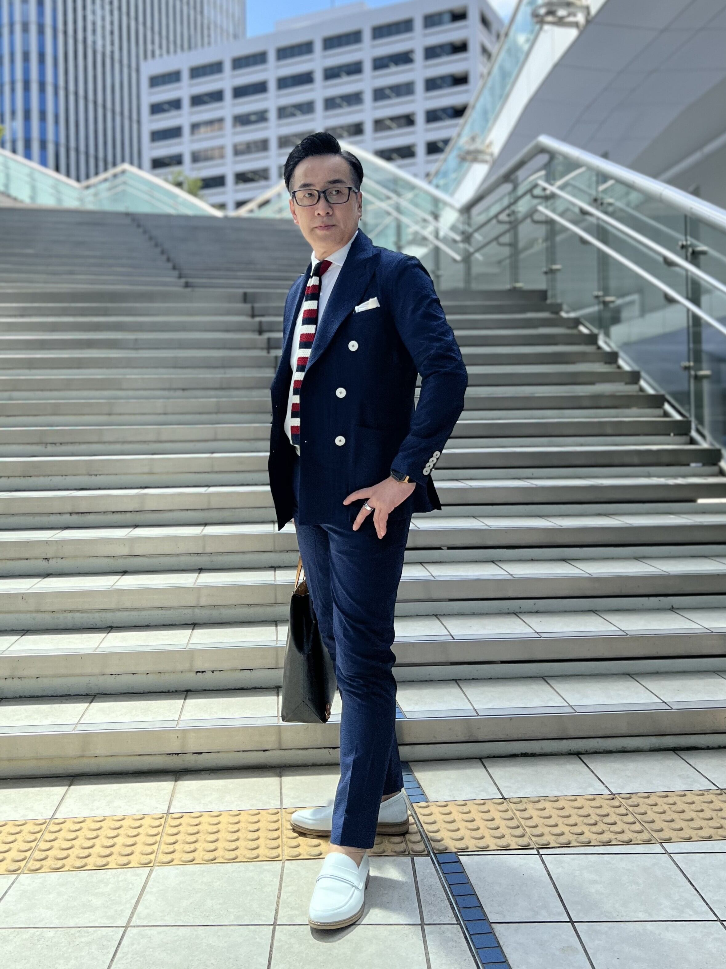 涼しさと着心地の良さにこだわったシアサッカー生地ダブルジャケットセットアップ。 肌にべったりと張り付かない凹凸のある生地で、ストレッチが効いているため、着ていて疲れません。 カラーは、ネイビー。ビジネスにもカジュアルにも綺麗に着られる、軽やかで上品なネイビーです。