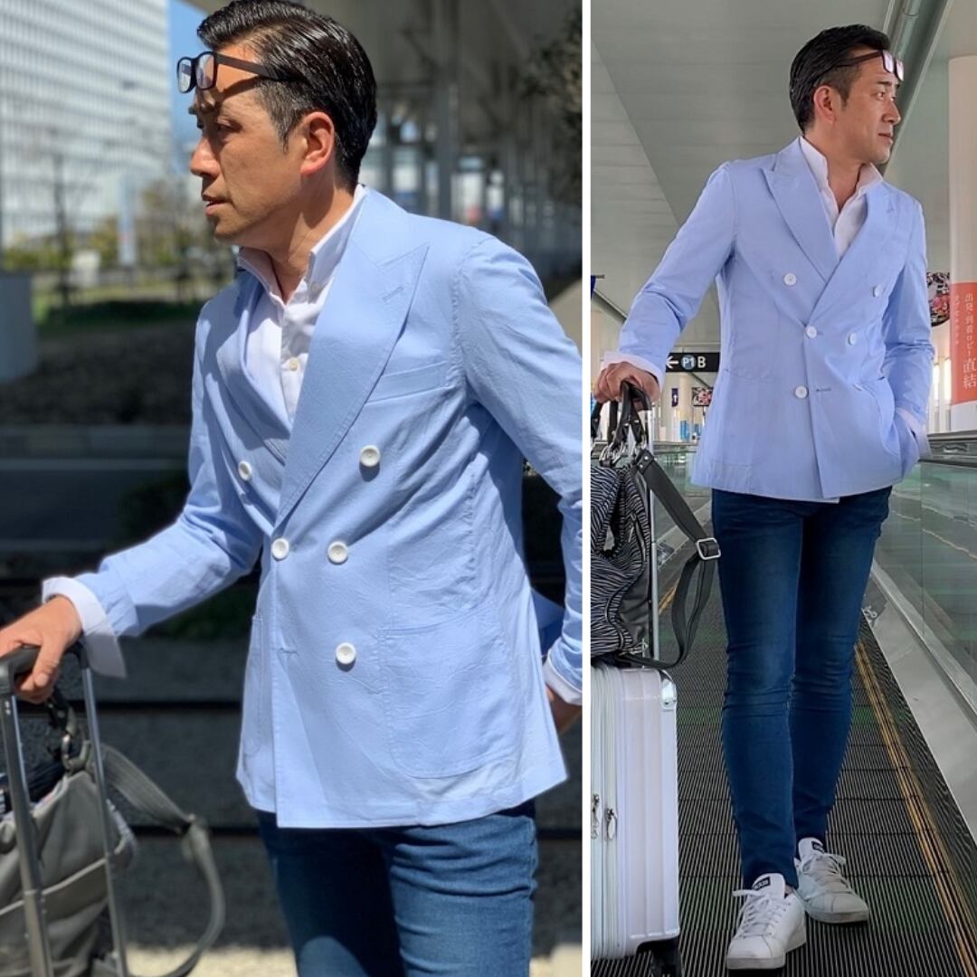 アイスブルーのシワ加工が新しい春夏メンズダブルジャケット。綿80%で真夏の日差しの下でも爽やかに着ていただけます。暑い時期にもジャケットを欠かさないお洒落な大人の男性に。