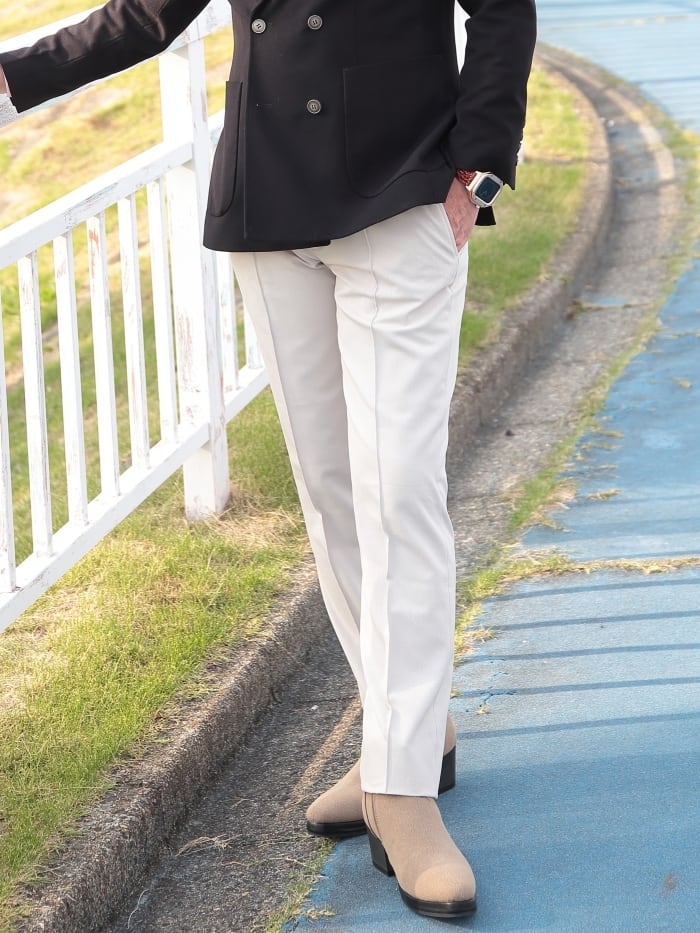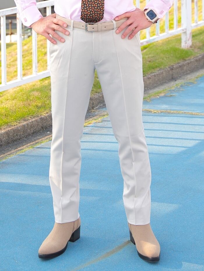 ポリウレタン混紡で軽いストレッチ性があるため穿きごこちが良く、シワになりにくいのも特徴です。カジュアルにも綺麗めにもコーデできるので、ビジネスはもちろん、旅行、パーティー、レジャーまで幅広くご着用いただけます。